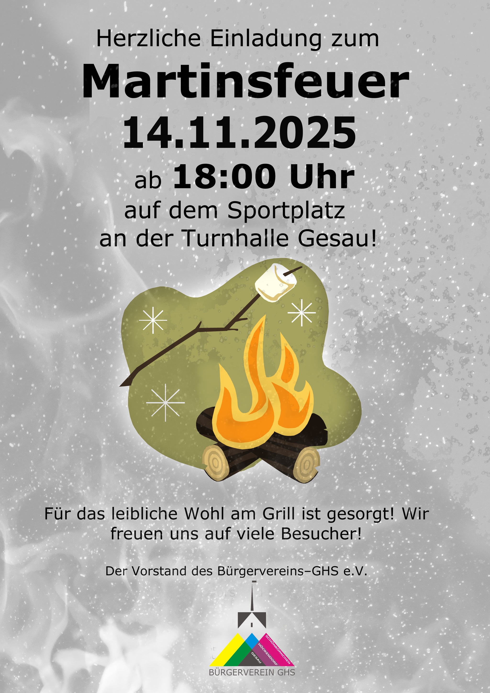 zu einem sehr stimmungsvollen Abend bei Feuer, Roster, Glühwein und netten Begegnungen. Der Bürgerverein durfte sich zum traditionellen Martinsfeuer über viele Besucher aus nah und fern und von Klein bis Groß an der Gesauer Turnhalle freuen. Ab 18 Uhr verbreitete sich im Schein des Feuers eine zauberhaft-gemütliche Atmosphäre, die bis in den späterem Abend anhielt. BV-GHS 14.11.25